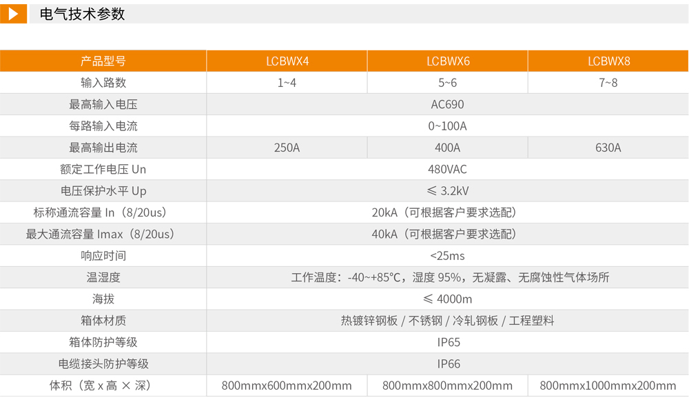 每路输入配置熔断丝,输出配备断路器和防雷器,提供短路、过载及雷击浪涌保护(标称放电电流40kA,可选100kA)。
