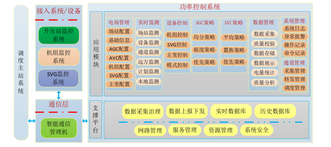 “电压自动控制系统(AVC)”具有“实时状态监测、异常事件告警、优化策略分析、控制策略下达、历史曲线分析”等功能模块。系统与逆变器/风机、无功补偿装置(SVC/SVG)、升压站综自系统通信,将采集的逆变器/风机和无功补偿装置实时运行数据上传调度主站,同时接收调度中心主站下发的 AVC 电压控制指令,经过模型分析和无功优化策略计算模块的分析计算,通过对逆变器/风机、无功补偿装置(SVC/SVG)、有载调压变压器分接头等设备的统一协调控制,实现场站并网点电压的闭环控制和场站的优化运行。通过电压自动控制系统,场站并网电压可以进行实时调节,以满足调度对电网运行的要求,AVC 能一定程度上改善场站并网电能质量。